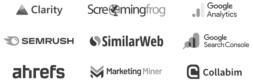 Screaming Frog, Ahrefs, Semrush, Marketing Miner, Collabim, Google Search Console, GA4, Google Sheets, Looker Studio, Bing Webmaster Tools